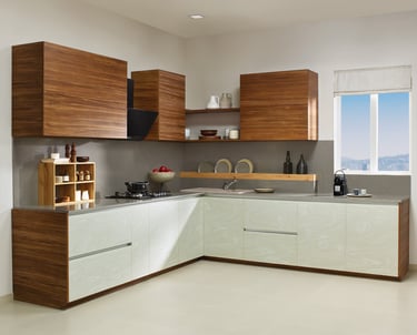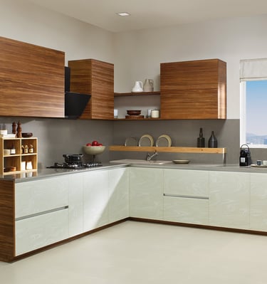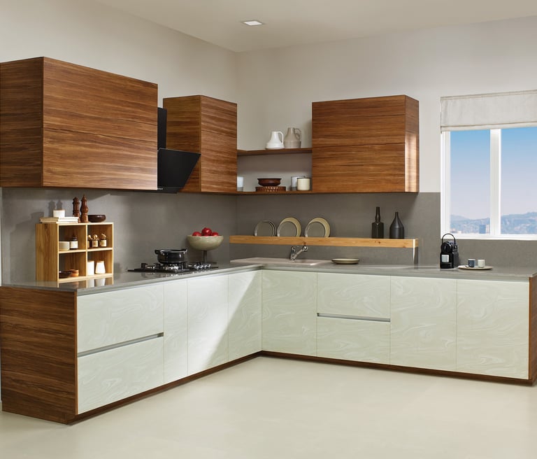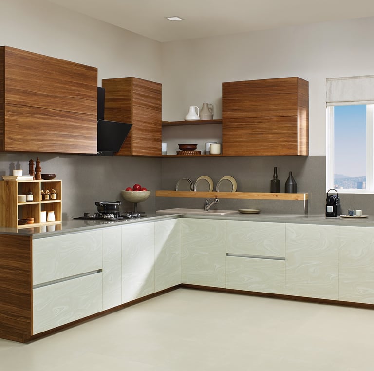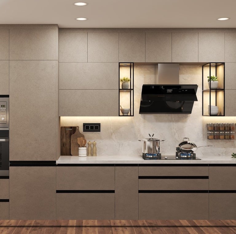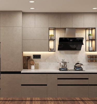 Elegant modular kitchen with Indian-inspired details.